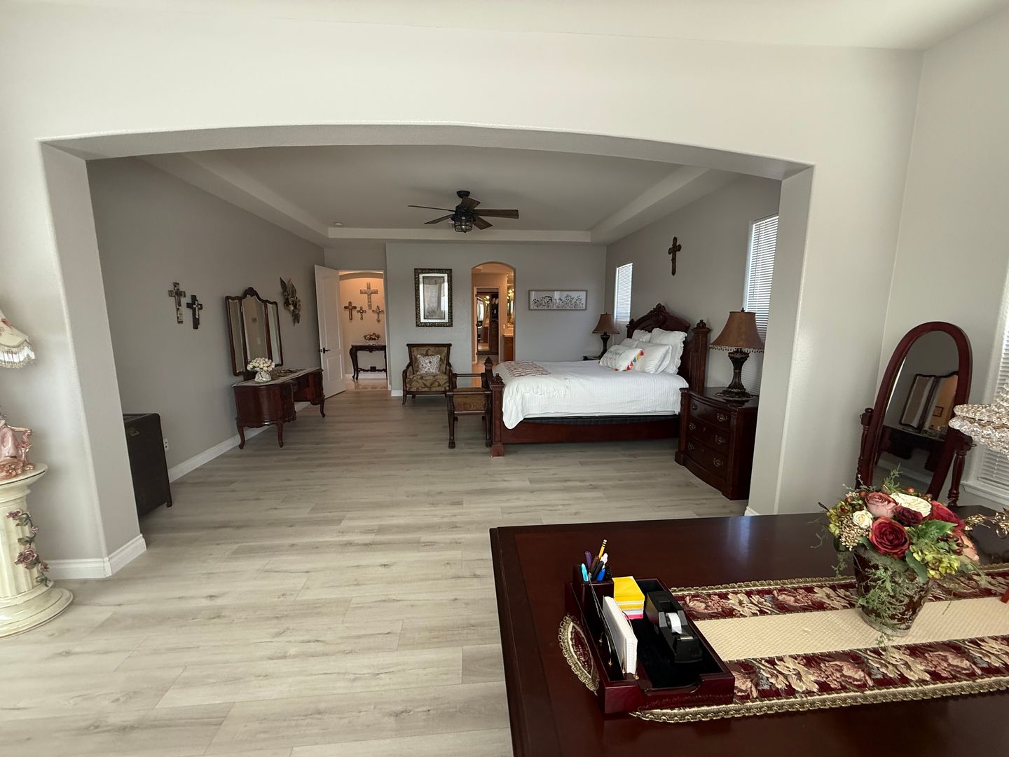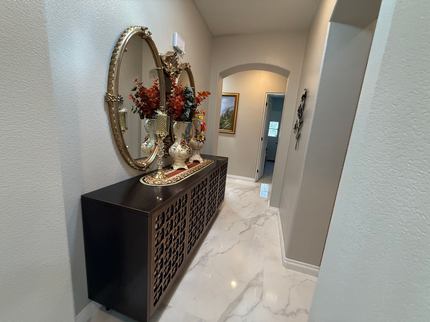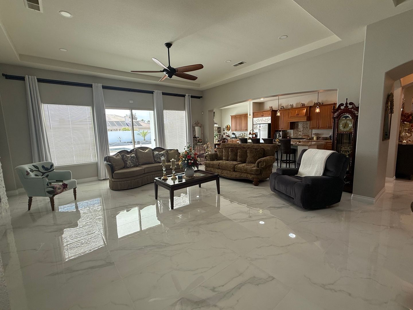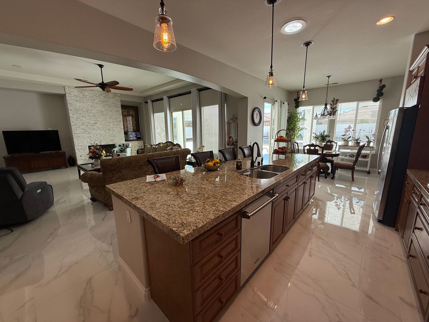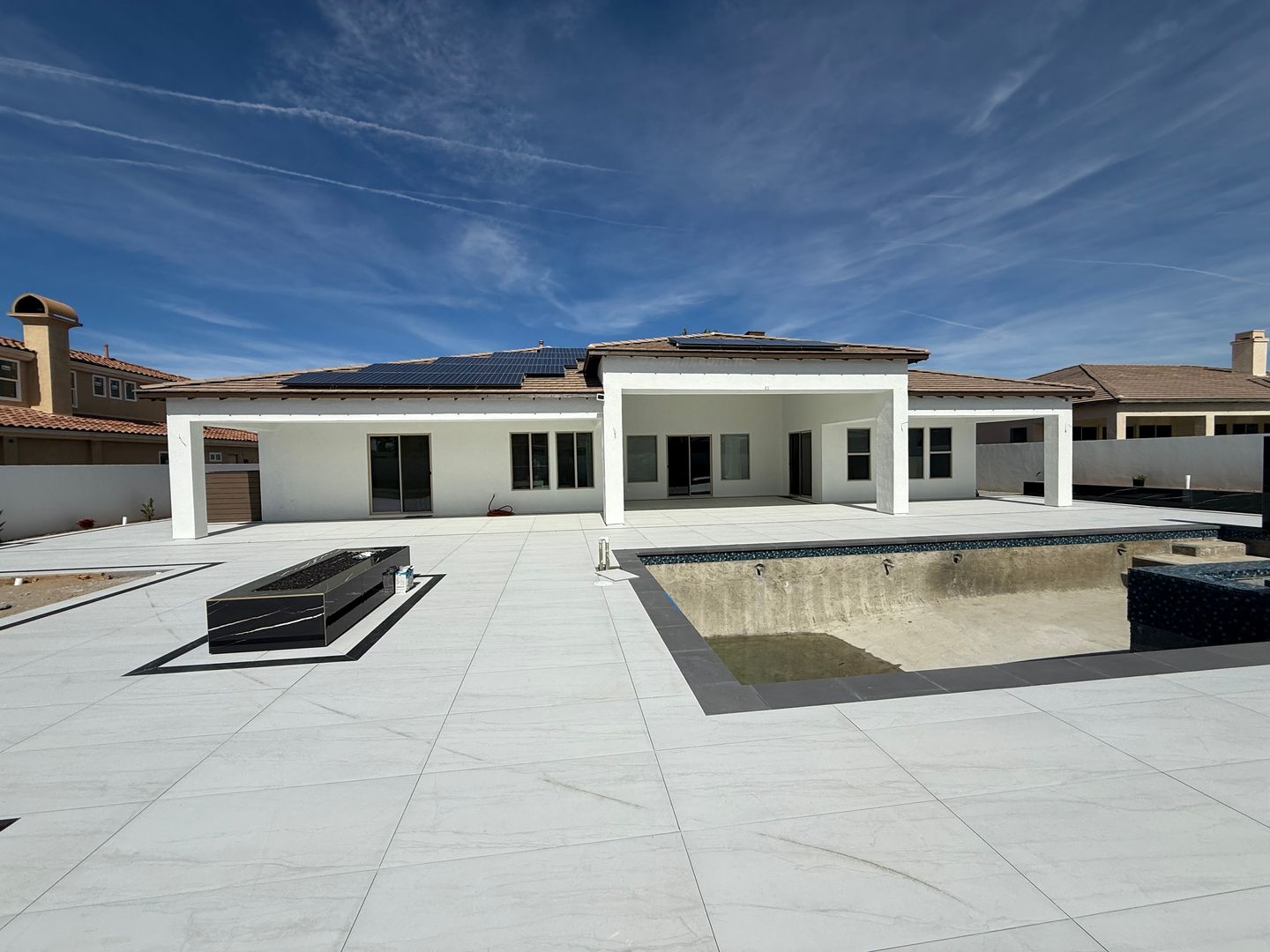 Stonebrook Estates- 3 Bedrooms, 3.5 Bathrooms, 3 Car Garage, 3351 Square Feet of Luxury & Entertainment, High Ceilings, Fire Sprinklers , Arched entry ways, Solar Panels, Tesla Charger, Gated Community, Lots of Natural Lighting, Beautiful Kitchen with granite countertops and an 11' long breakfast bar that comfortably seats five, Lots of cabinets, Double Built-in Oven, Stainless Steel Appliances, Kitchen opens to large family room with an elegant fireplace with a stone wall that reaches to the ceiling and two entertainment walls to the sides, Breakfast nook has a large buffet counter top and lots of cabinets, The home has three slider glass doors that open to the enormous covered patio, Wide hallways and built-in linen cabinets. Each guest bedroom has a spacious closest and its own private bathroom, Main bedroom has a separate siting area ideal for an office, Bathroom has a Roman tub and a separate shower, Double bathroom sinks with separate countertops and a vanity, Main closet has built-in shelves and cabinets, Indoor laundry room has a utility sink and large folding counter top with lots of cabinets, shelves and a door leading to the outside, Back patio is covered from side to side and also has beautiful no-slip tile floors. Block walls through out, Community amenities offers security patrol, community pool, pickleball and tennis courts. (Built-in Swimming Pool & Ground Fire Pit Under Construction). Close to schools, shopping and restaurants. For more information or to schedule a viewing, please contact Maria De La Torre at (760) 242-6086